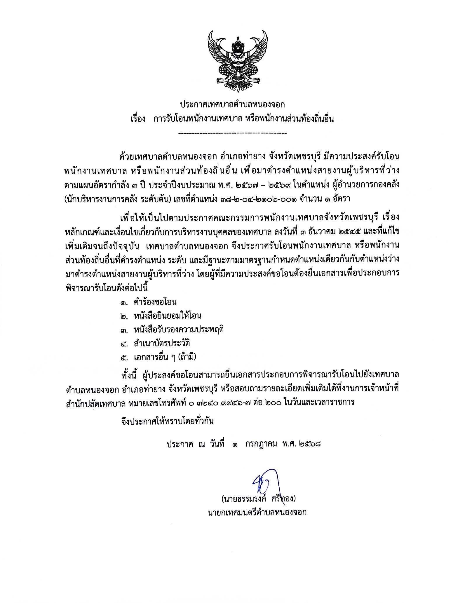 ประกาศเทศบาลตำบลหนองจอก เรื่อง การรับโอนพนักงานเทศบาลหรือพนักงานส่วนท้องถิ่นอื่น